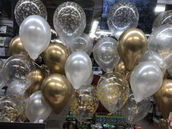 4- glitter balloon, 4-chrome gold latex balloons, 4 – clear with gold dot, 3- pearl white